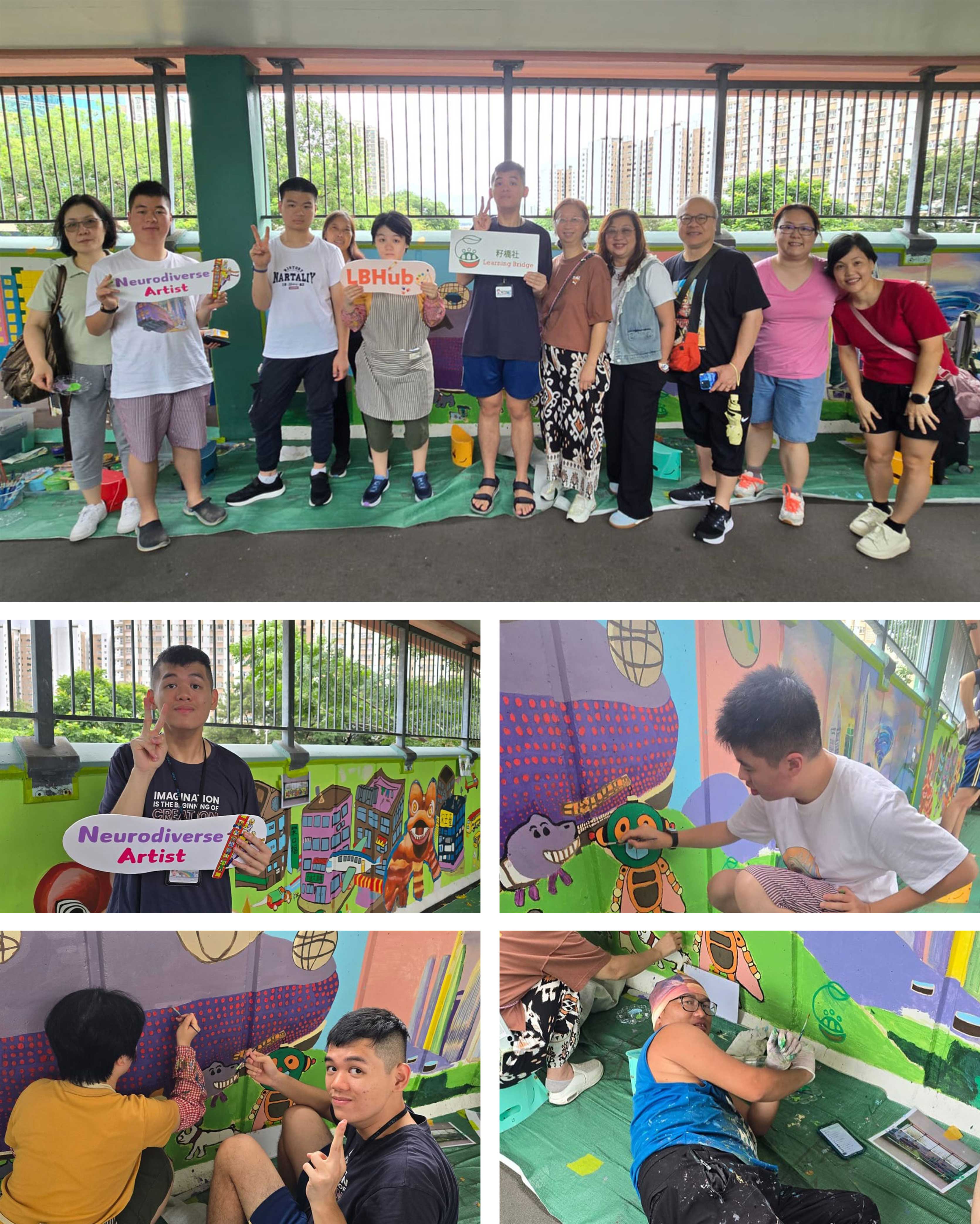 這次活動是「港深獨特的美 - 建造業青年美化天橋行動」,我們的壁畫選取了籽橋社「獨特的美 - 港深建築物」的八幅得獎作品。看到自己的作品在天橋上展示,年輕藝術家們充滿自信,努力地為壁畫填上色彩,為這個地方增添了無限活力! 🎨💪